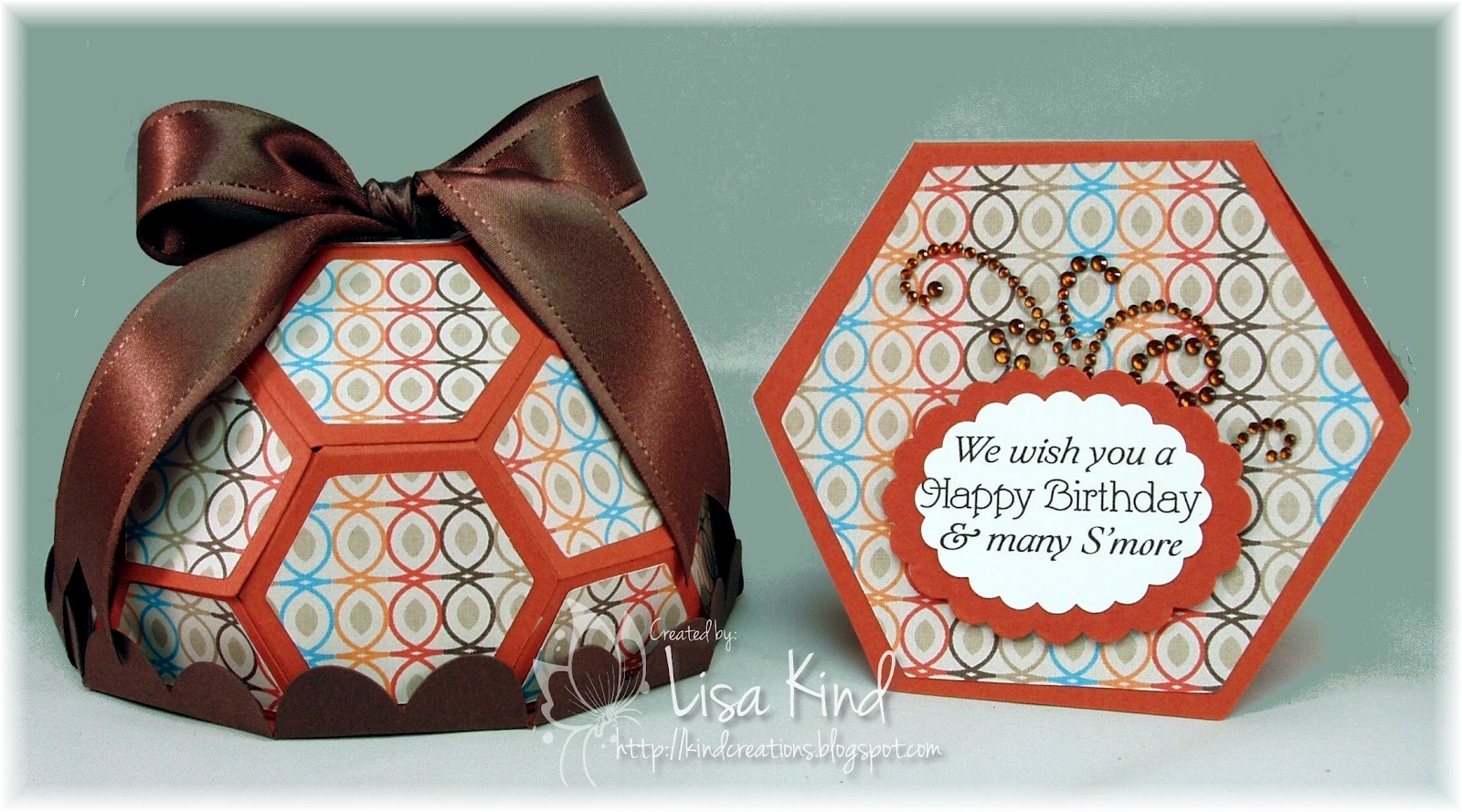 For the card, I took one of the hexagons and increased the size, made two of them, then welded them together using the SCAL program and cut it out. I made a mat with the digital paper by sizing it down. The sentiment is from a set being released this month called So Much S'more. (Are you seeing the theme here?) I punched it out with a Marvy punch and added a bling flourish.